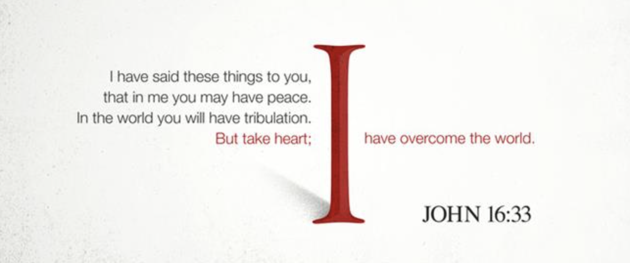 Jesus tells us, “I have said these things to you, that in me you may have peace. In the world you will have tribulation. But take heart; I have overcome the world.”