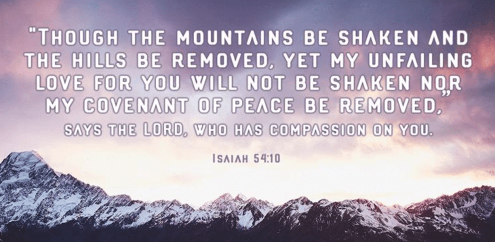 “Though the mountains be shaken and the hills be removed, yet my unfailing love for you will not be shaken nor my covenant of peace be removed” (Isaiah 54:10).