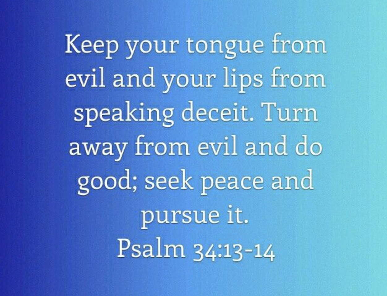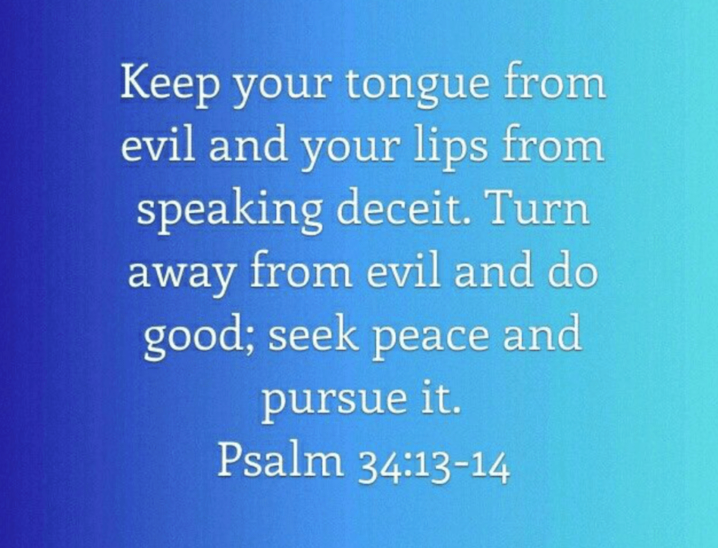 “Keep your tongue from evil, and your lips from speaking deceit. Depart from evil, and do good; seek peace, and pursue it” (Psalm 34:13-14)