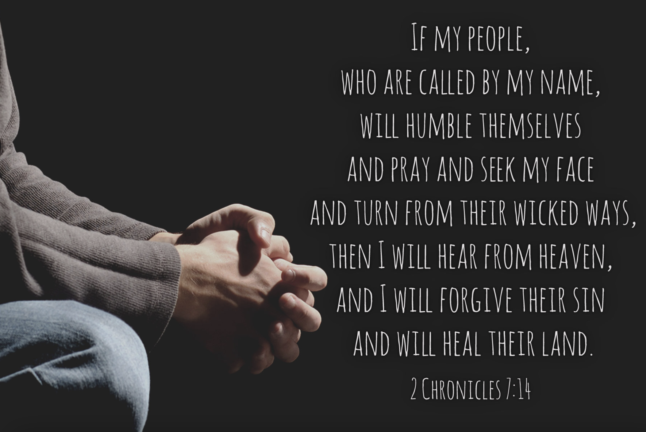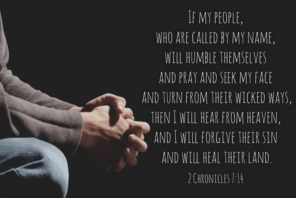 “If my people who are called by my name, will humble themselves and pray and seek my face and turn from their wicked ways, then I will hear from heaven, and I will forgive their sin and will heal their land” (2 Chronicles 7:14).