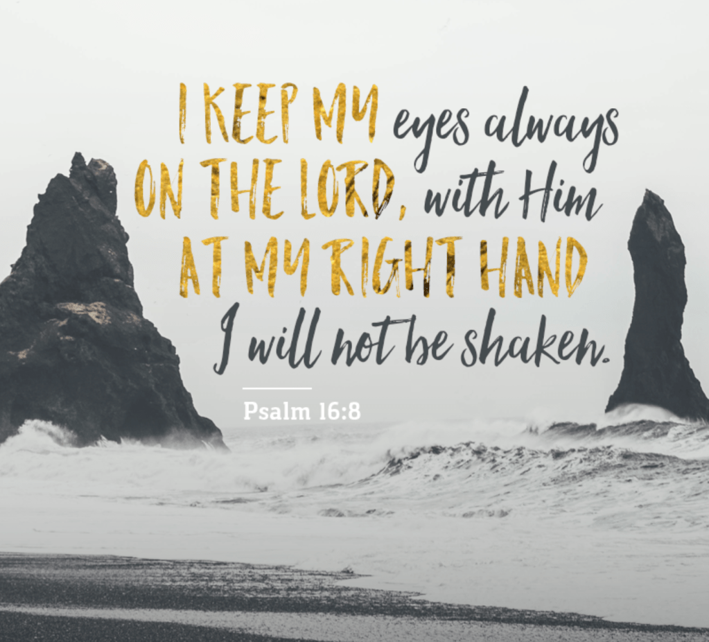 “I keep my eyes always on the LORD. With him at my right hand, I will not be shaken” (Psalm 16:8).