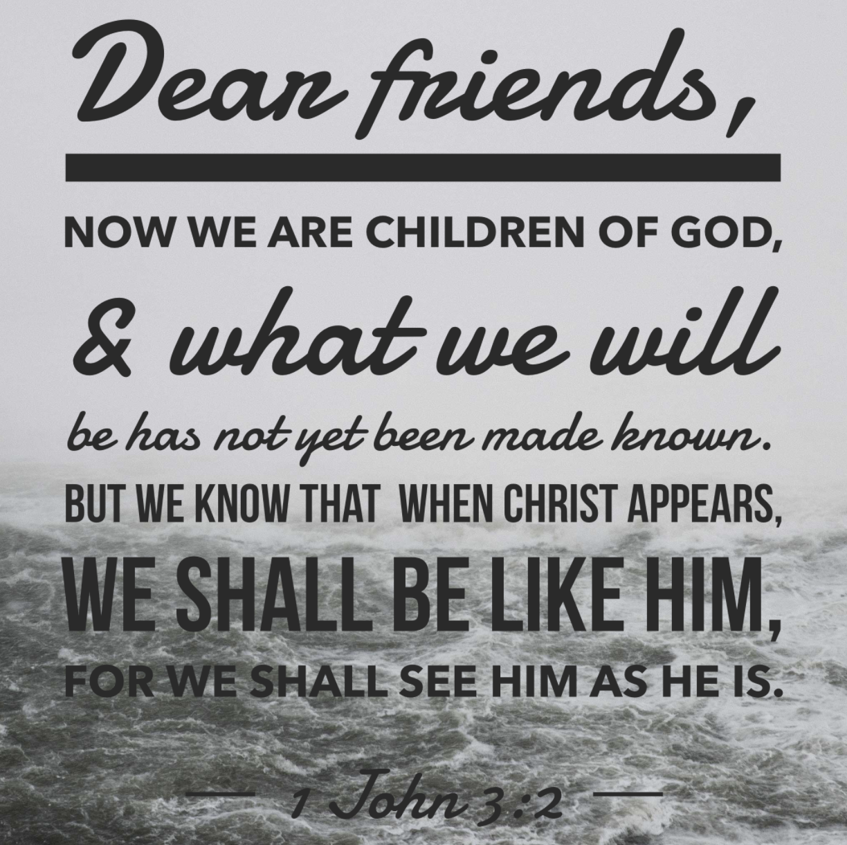 “Dear friends, now we are children of God, and what we will be has not yet been made known. But we know that when Christ appears, we shall be like him, for we shall see him as he is” (1 John 3:2).