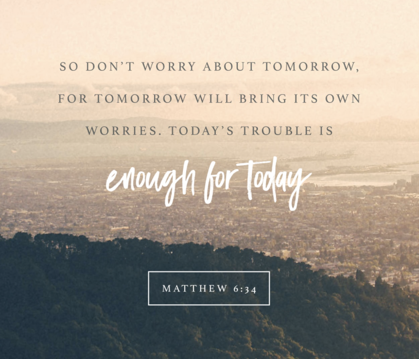 “Therefore do not worry about tomorrow, for tomorrow will worry about itself. Each day has enough trouble of its own” (Matthew 6:34).