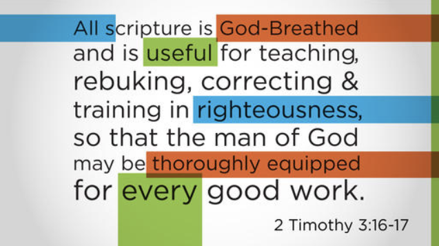 “All scripture is God-breathed and is useful for teaching, rebuking, correcting, and training in righteousness, so that the servant of God may be thoroughly equipped for every good work” (2 Timothy 3:16-17).