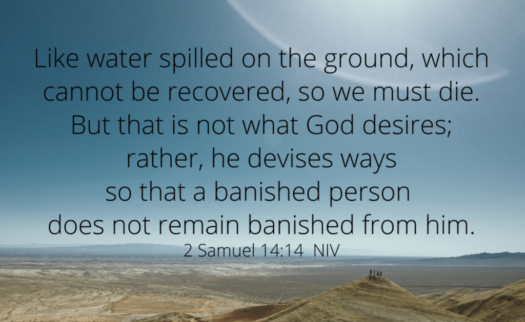 “Like water spilled on the ground, which cannot be recovered, so we must die. But that is not what God desires; rather, he devises ways so that a banished person does not remain banished from him” (2 Samuel 14:14).