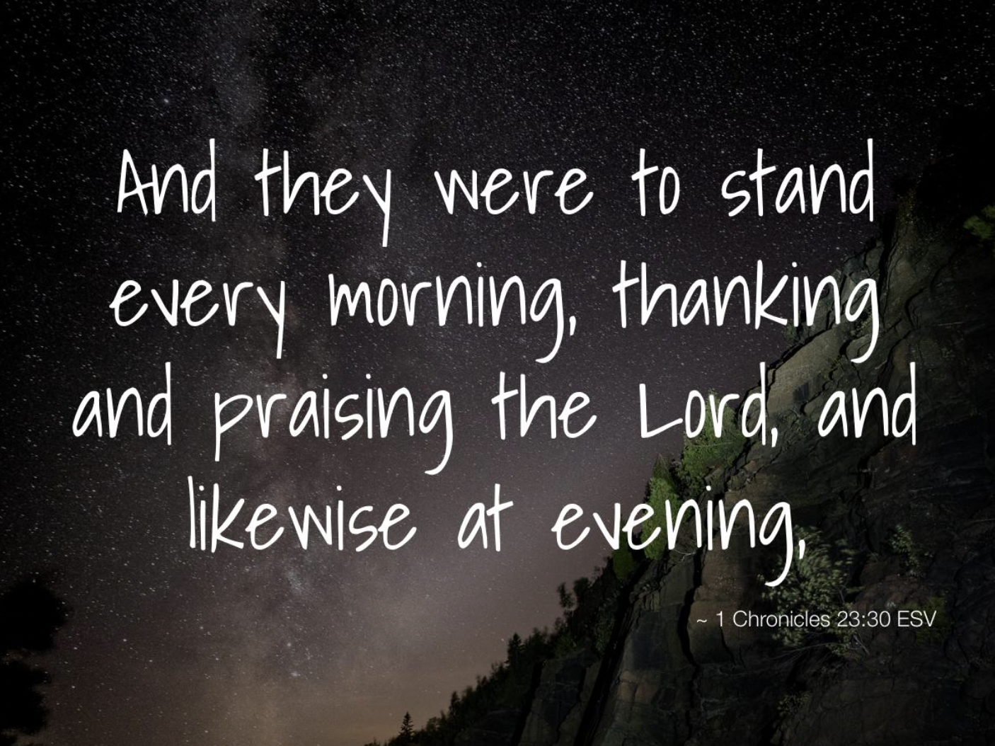 “The duty of the Levites was to help Aaron’s descendants in the service of the temple of the LORD…They were also to stand every morning to thank and praise the LORD. They were to do the same in the evening” (1 Chronicles 23:28, 30-31).