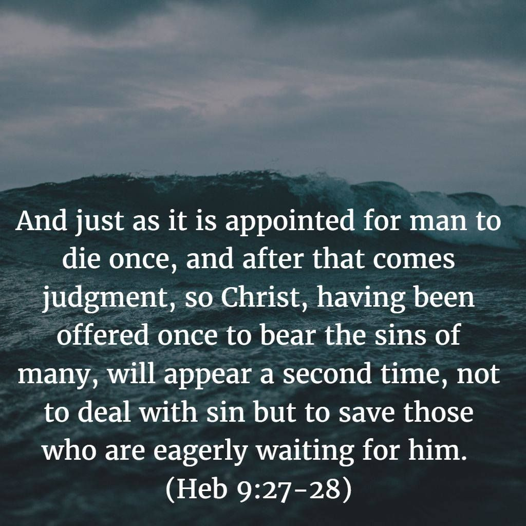“Just as people are destined to die once, and after that to face judgment, so Christ was sacrificed once to take away the sins of many; and he will appear a second time, not to bear sin, but to bring salvation to those who are waiting for him.” – Hebrews 9:27-28