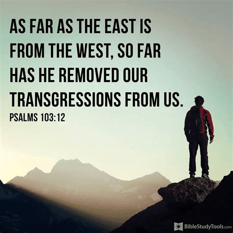 Listen to God. He declares, “I will remember their sins no more.” In fact, God tells us in Psalm 103:12, “As far as the east is from the west, so far has he removed our transgressions from us.”