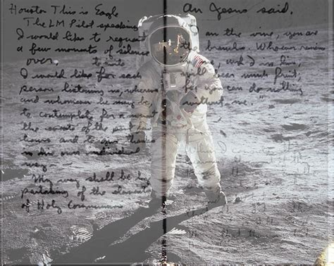Mr. Aldrin said that he agreed not to read the words over the radio, but only “reluctantly.” I find his own words of the event very moving: “I ate the tiny Host and swallowed the wine. I gave thanks for the intelligence and spirit that had brought two young pilots to the Sea of Tranquility. It was interesting for me to think: the very first liquid ever poured on the moon, and the very first food eaten there, were the communion elements.”