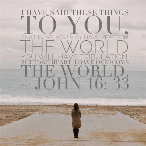 “I have told you these things, so that in me you may have peace. In this world you will have trouble. But take heart! I have overcome the world” (John 16:33).